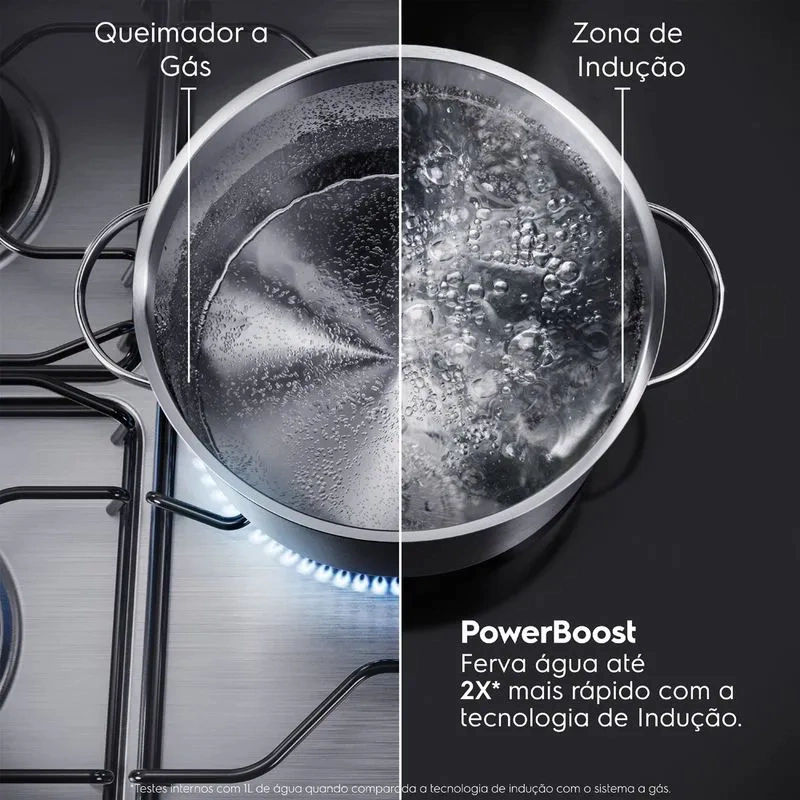 Economia de Energia e Tempo: As zonas de indução são extremamente rápidas e aquecem apenas a panela, sem desperdício de energia. Isso significa que seu tempo de cozimento será mais rápido e, consequentemente, o consumo de energia será menor. Para pratos mais demorados, você ainda tem a potência do gás, que nunca deixa a desejar.